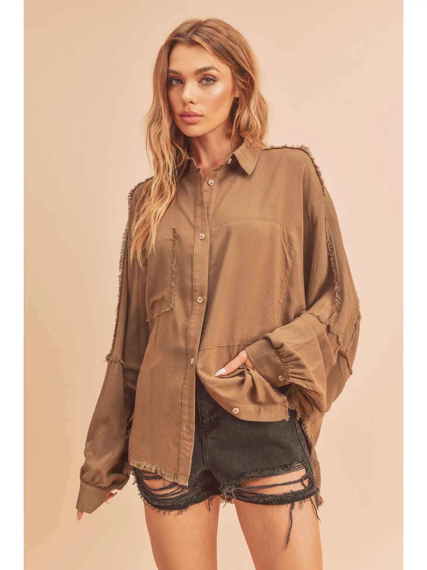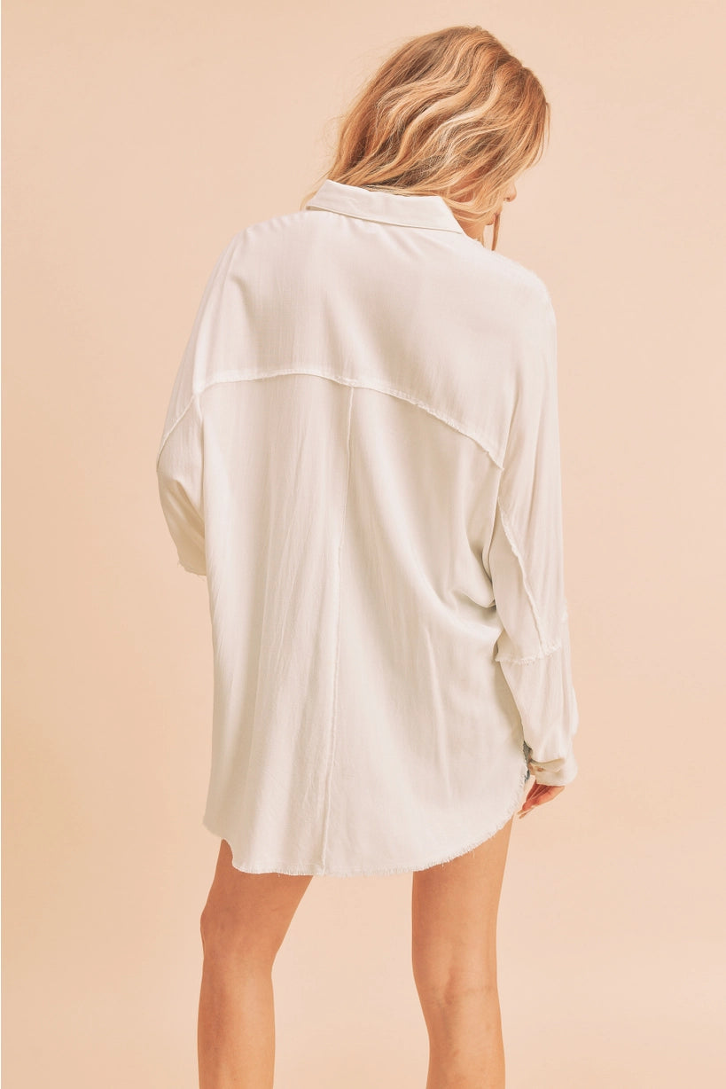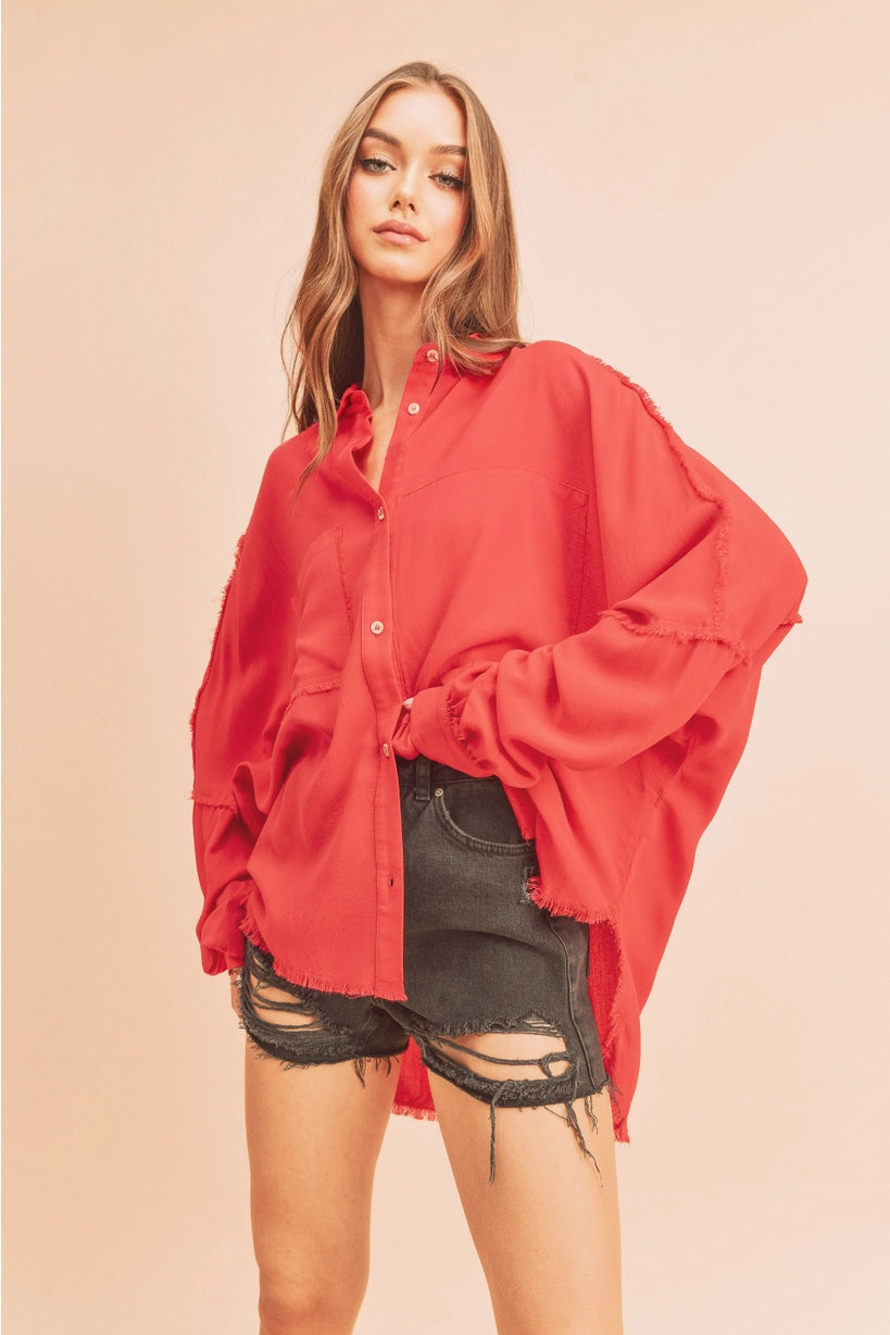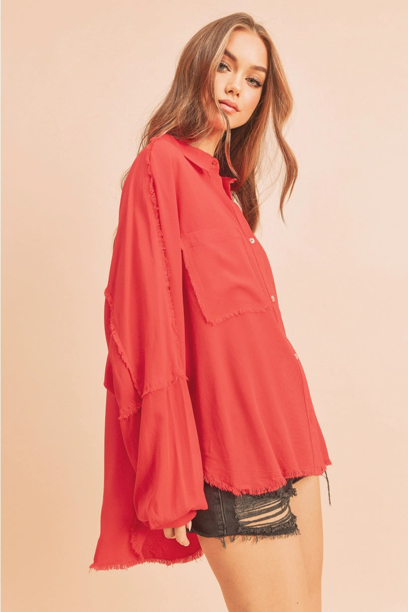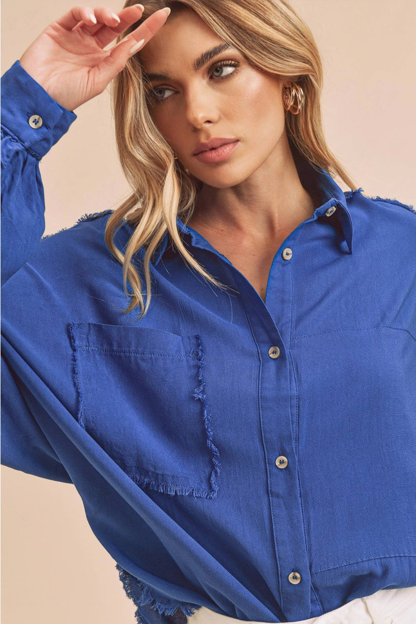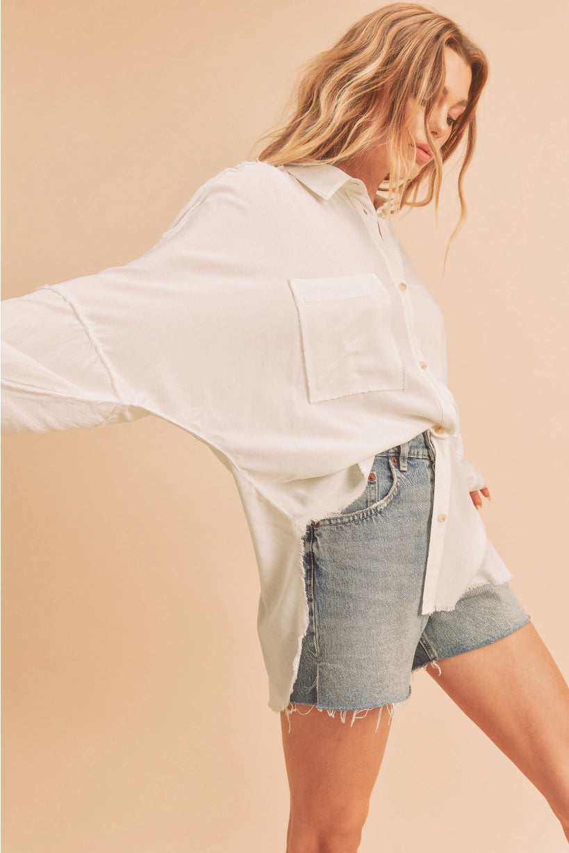 Looking for a classic piece? But it has to be cute, comfortable, breathable & versatile??? Ladies. THIS IS IT. 100% Cotton for all of the air! The Amanda Top goes everywhere-tucked into your favorite denim, wear her unbuttoned at the beach, give it a high waisted tie, wear it loose over leggings... Special frayed hem details gives it that unique touch on the chest pocket, shoulders & billowed sleeves. Oversized.* Model shown wearing a size small. We have the colors you need!