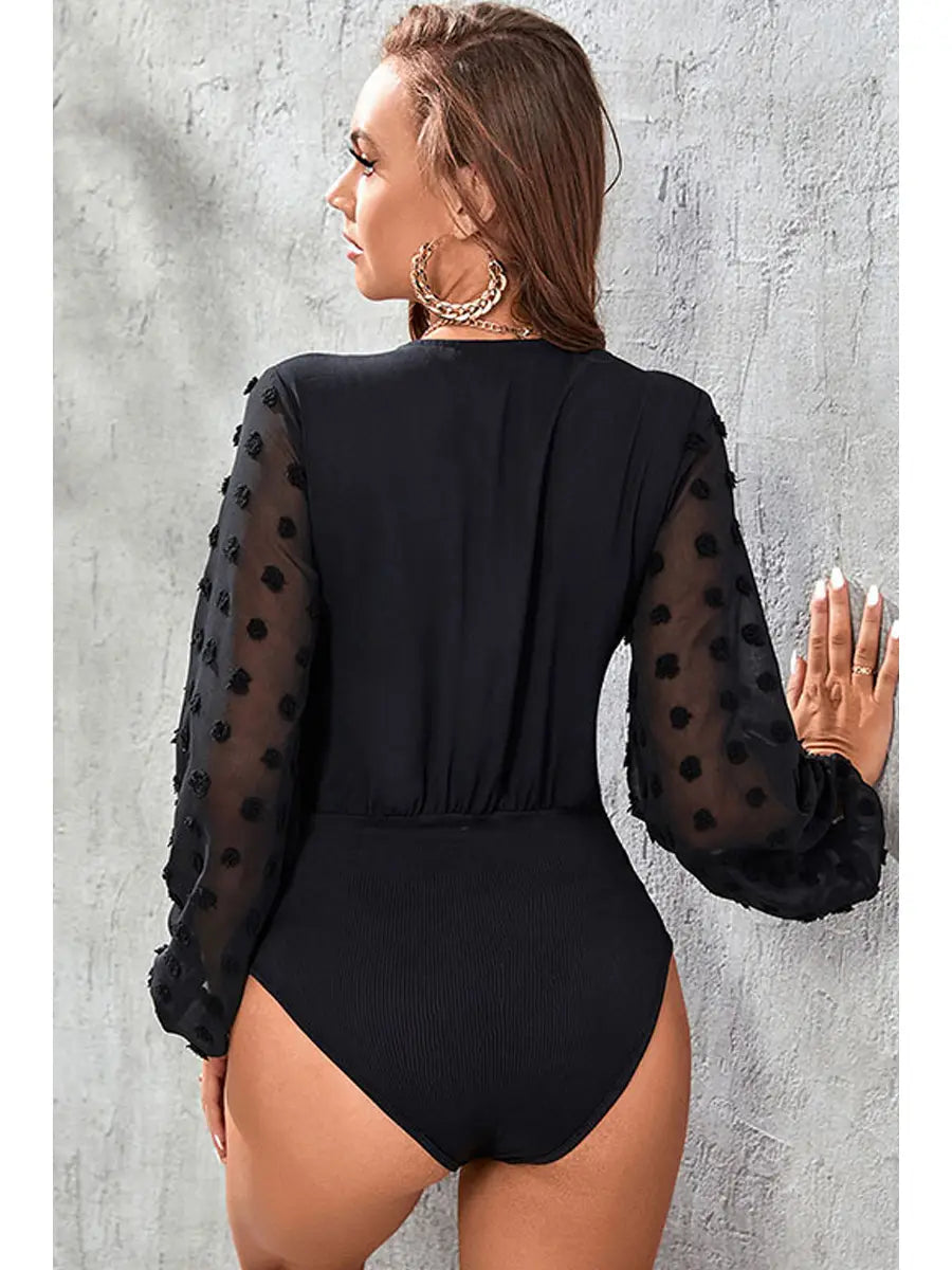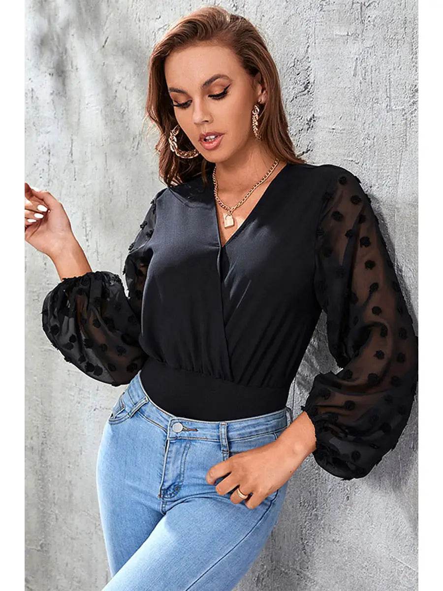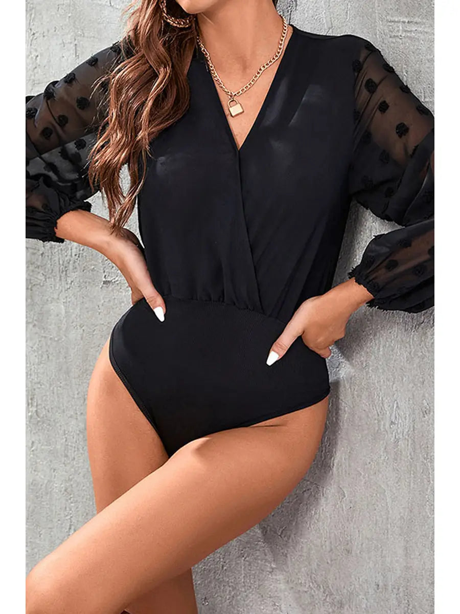 This Bodysuit is your New Bestie. Sure to compliment your silhouette, surplice V neck body suit is easy & soft with snap closure. Oopaque bodice-Billowy & sheer Swiss dot sleeves adds elegance to your classic look. Keep it casual with your favorite jeans, our new skorts, or dress her up with your best maxi.