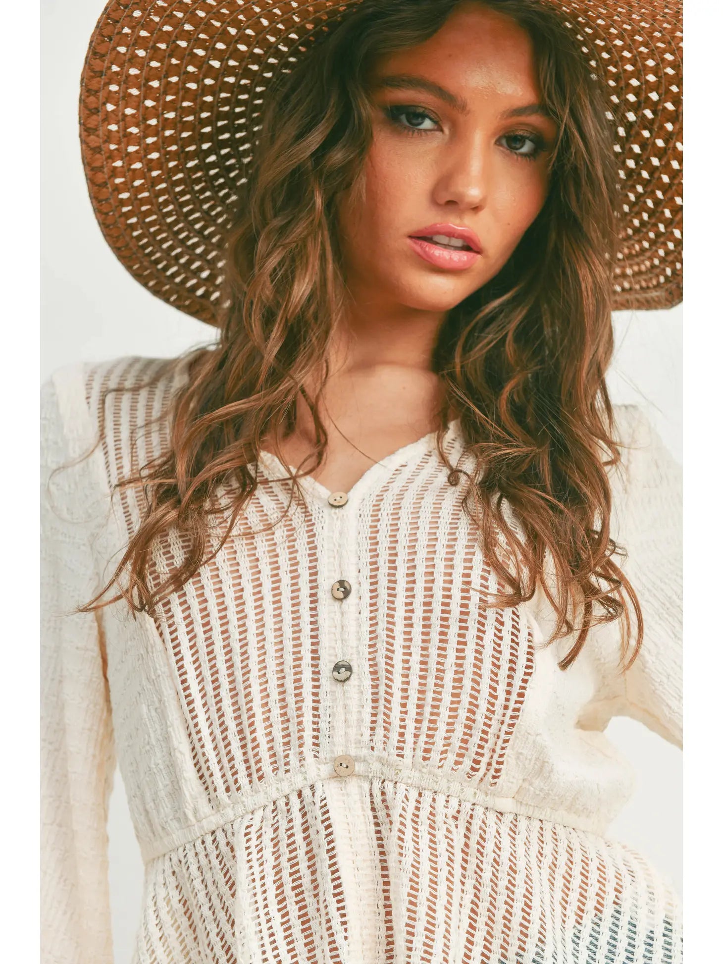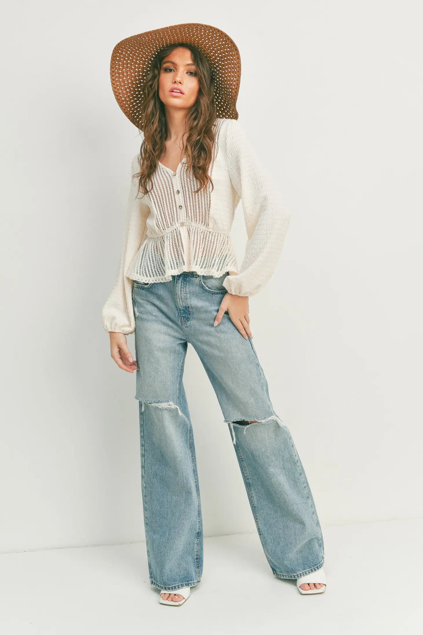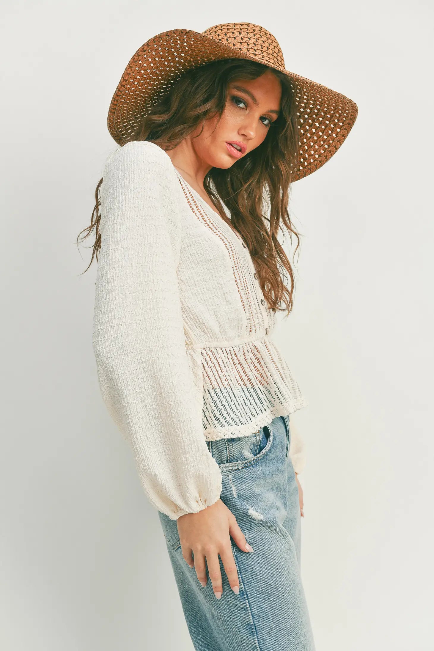 So Sweetly Slimming! Our Forever Yours Peplum Top accentuates Your waist & carefully crafted eyelet blocking in front slims you down in the best way. Vanilla colored with beautiful bishop sleeves that define your shoulders. Fabulous stretch for comfort. Too Fun Warning: Eyelet area is a tad on the sassy side! She's widely woven, perfect with your favorite cami, and your best pair of jeans