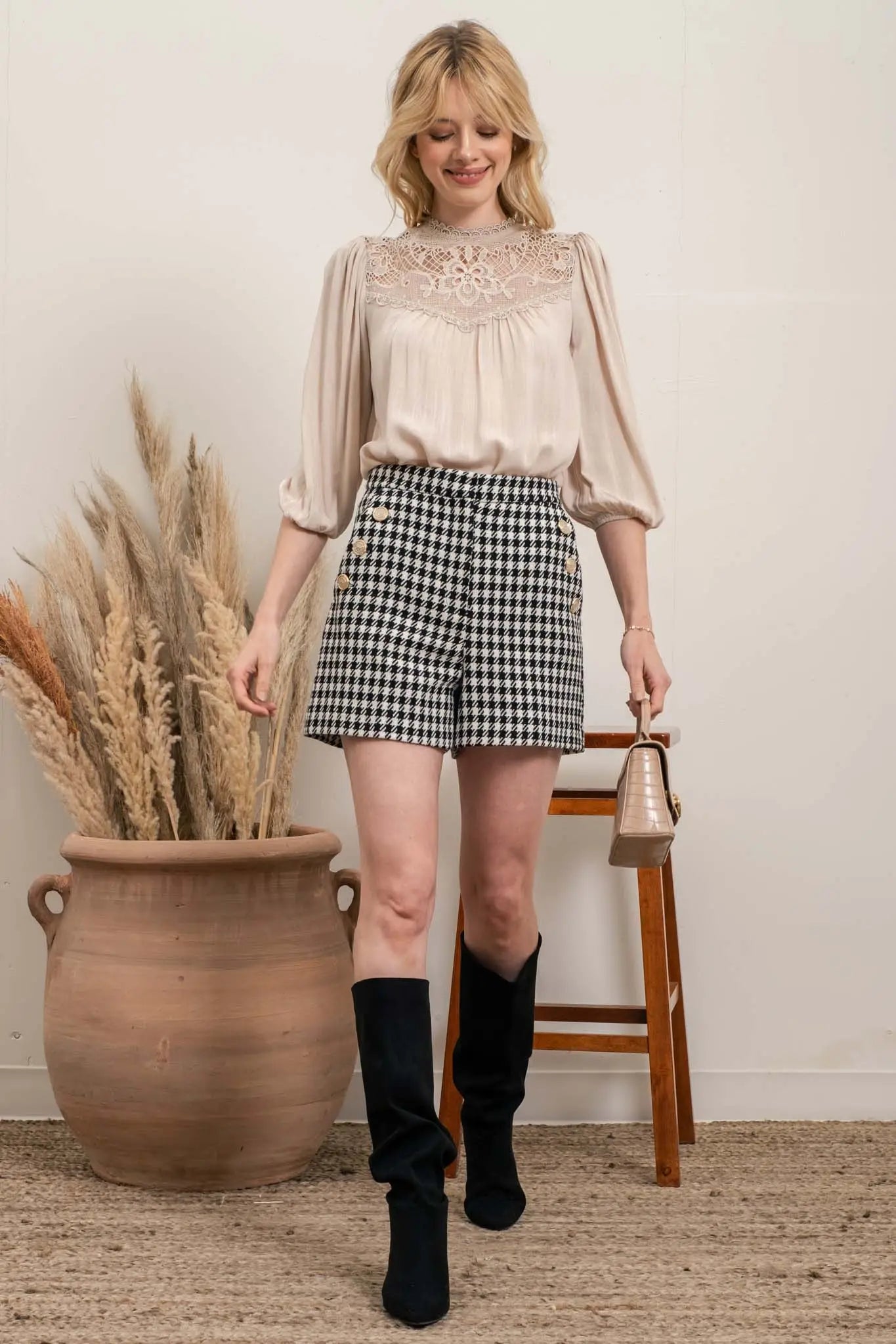 Easily add a big splash of Elegance in our No Effort Elegance Top. This comfortably soft blouse features beautifully laced mock neck, back button keyhole closure, and pleated 3/4 bubble sleeves. Elevate your favorite pair of jeans, or tuck this must have into your favorite skirt for any occasion. Class it up in oat or black.