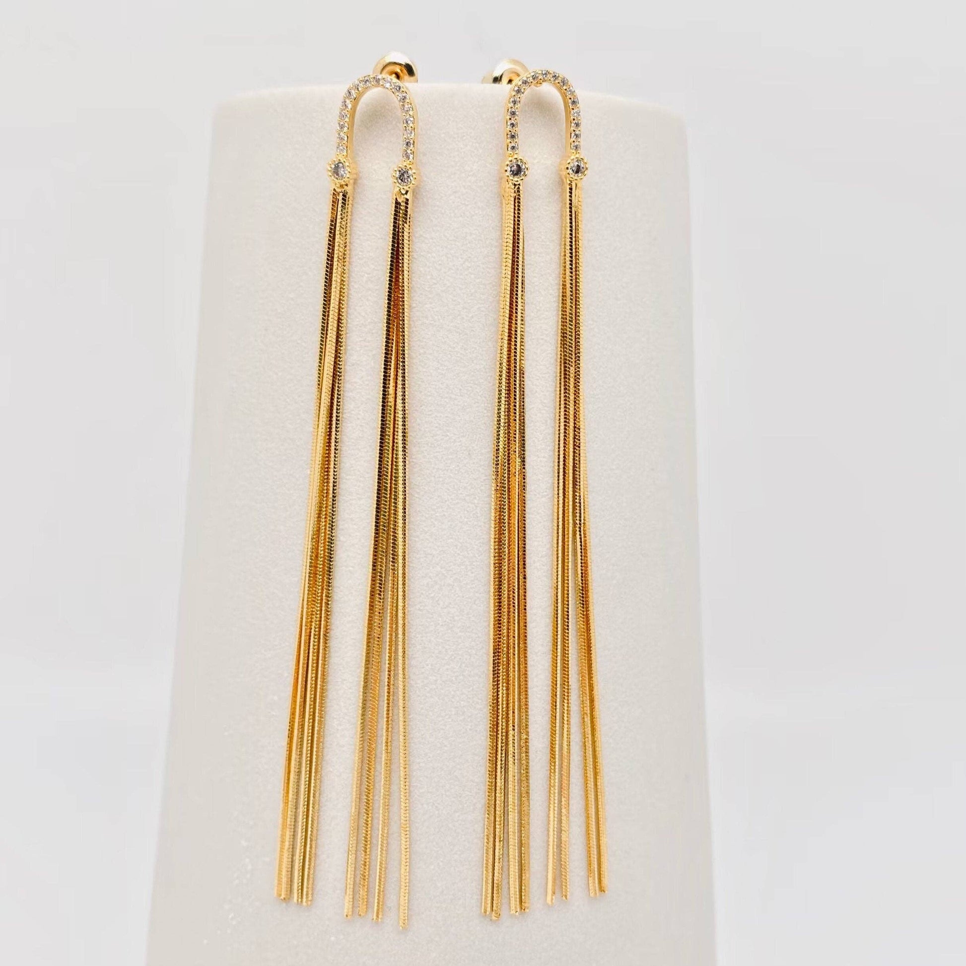 Add the best touch of glamour to your look, with these stunning Danglers! Perfect for special occasions or elevating your every day style, the Shine Down Danglers bring the best shine. Sparkling U Shape with cascading metal tassels and shimmering stones.