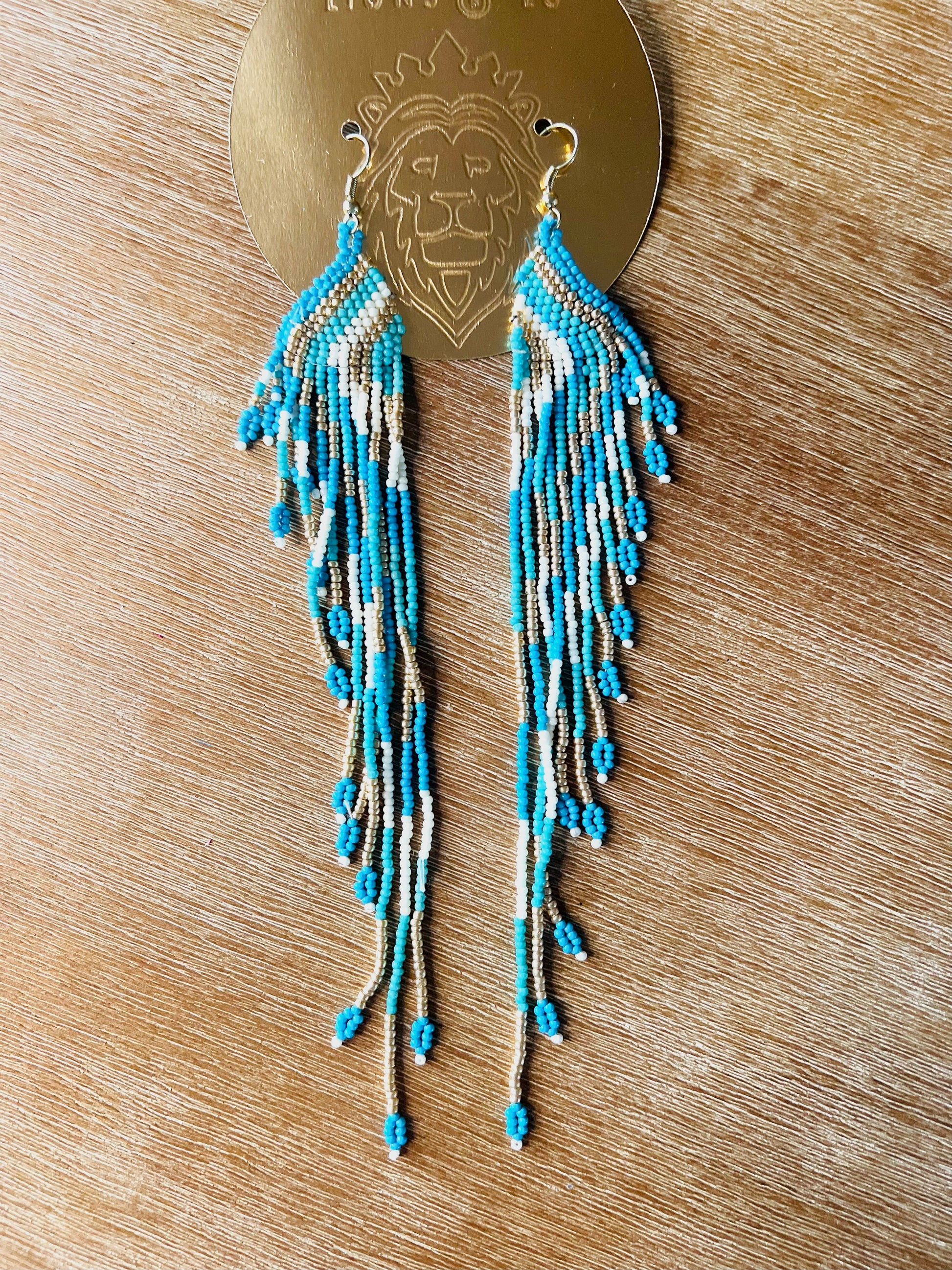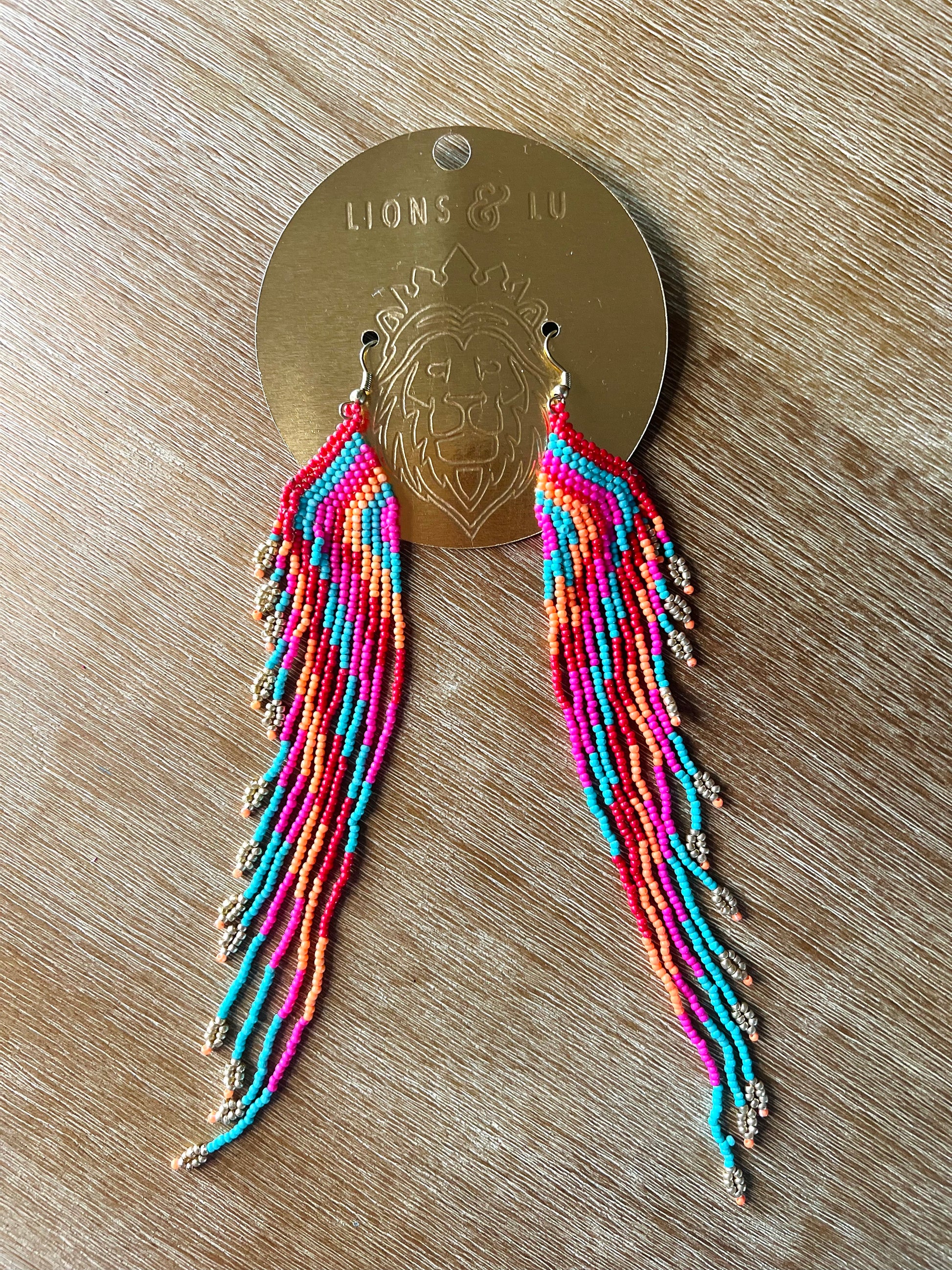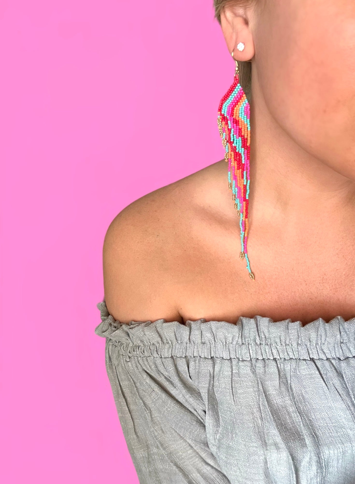 Vibrant Seed Bead Mega Danglers make an eye catching punch at 7.25" long-These light beauties dance on your shoulders day and night! Available in Stunning Ocean Blue & Fun Flamingo Fiesta! Pair with one of our favorite Off Shoulder Tops.